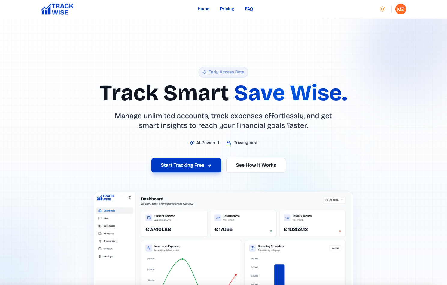 Track Wise is a personal finance management web application designed to help users track their expenses, manage budgets, and gain insights into their spending habits. The application features an intelligent AI agent that can perform any financial management task through natural language commands, eliminating the need for manual data entry.